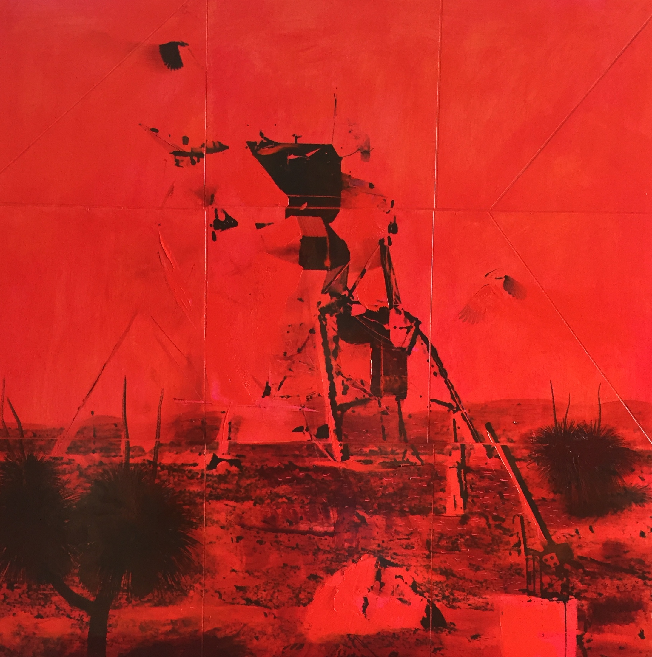 While developing these images, I thought how mystifying the first sighting of western vessels must have been to the Indigenous people of Australia, while now in the 21st Century, the crafts of the Apollo missions are already looking retro and historical to us. The lunar modules in my paintings are transplanted in abbreviated Australian landscapes; they are incongruous and exiled from their real history to suggest the ruins of antiquity in a land older than the pyramids.